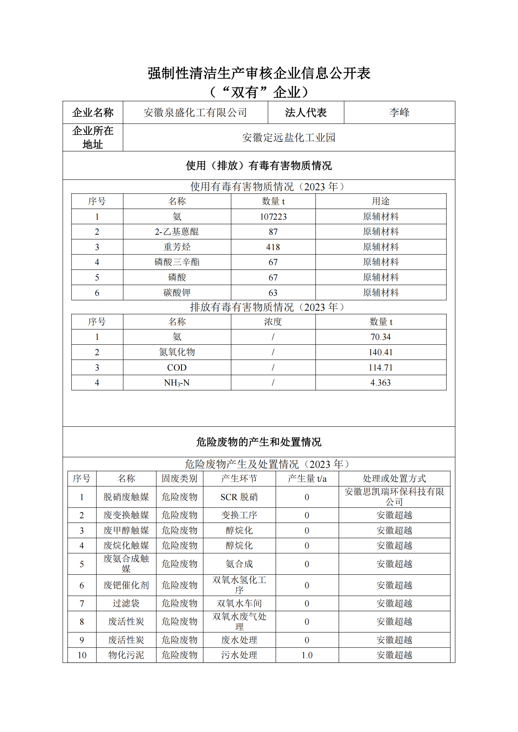 2022 年安徽泉盛化工有限公司环境信息公开表